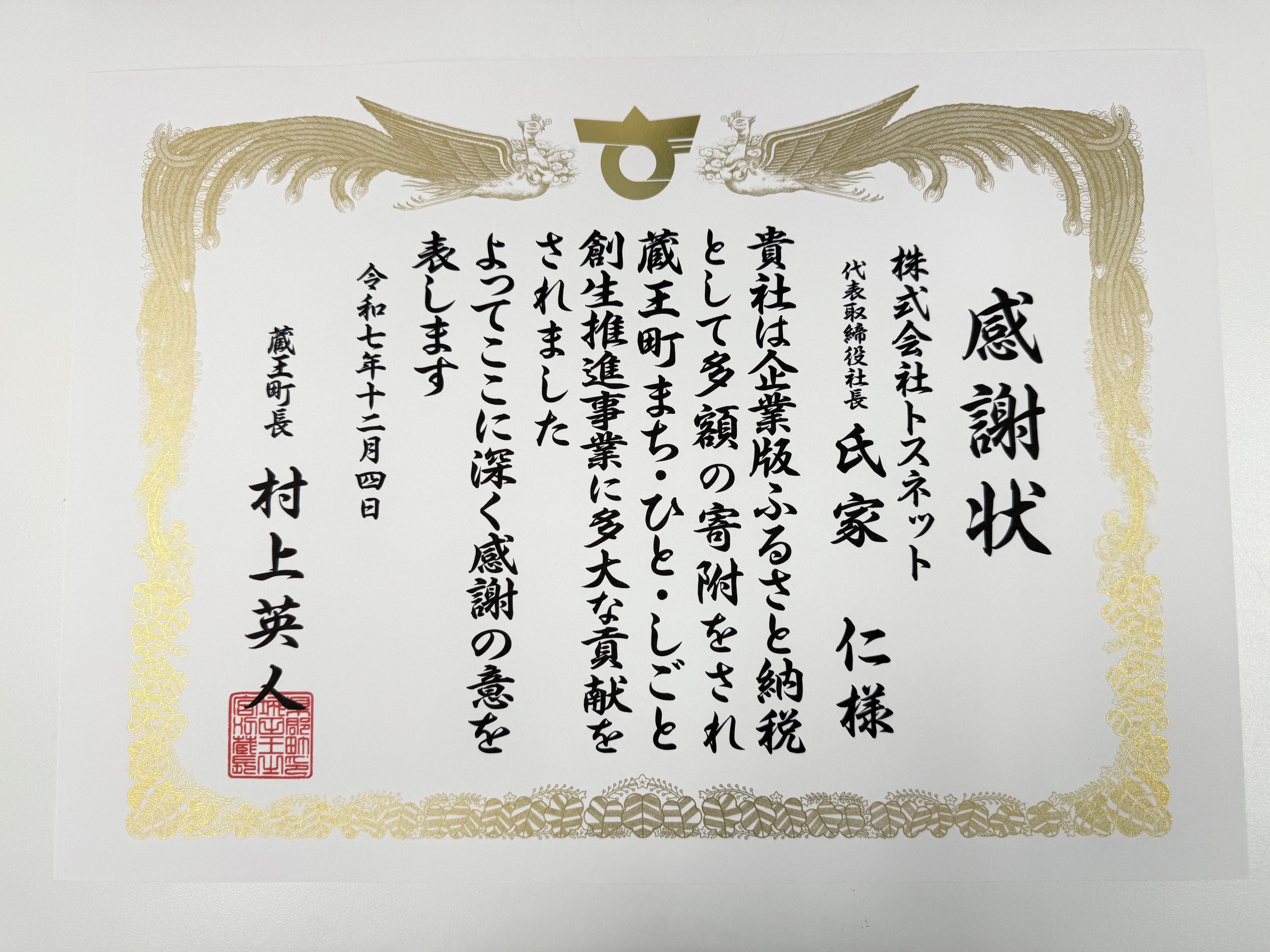 株式会社トスネットは蔵王町に対し企業版ふるさと納税制度を活用し寄附を行い、