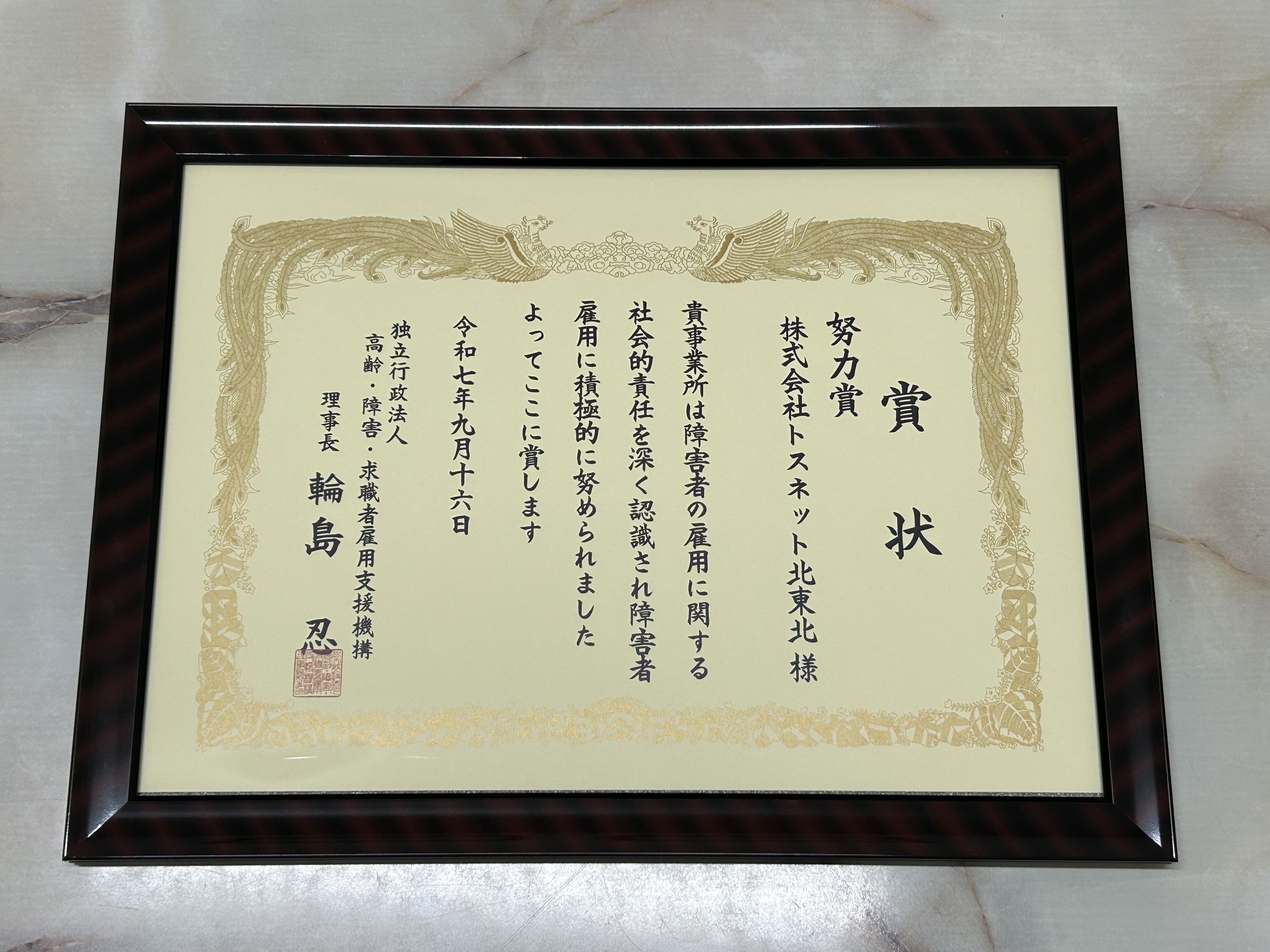 トスネット北東北は、令和7年9月16日に独立行政法人高齢・障害・求職者雇用支援機構さまより、積極的な障がい者の雇用の促進と職業の安定に貢献したとして「令和7年度障がい者雇用優良事業所 努力賞」を受賞しました。