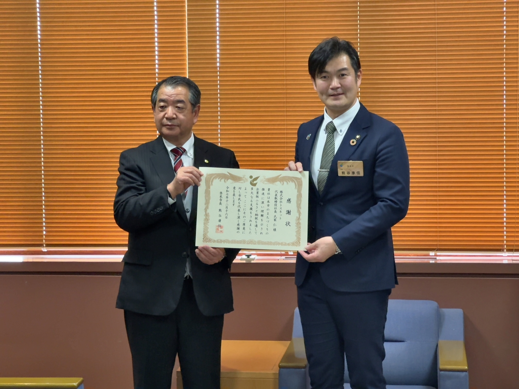 株式会社トスネットは登米市に対し企業版ふるさと納税制度を活用し寄附を行い、令和7年12月16日に登米市役所にて感謝状贈呈式がありましたのでご報告させていただきます。